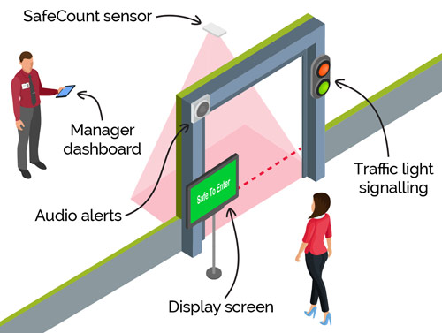 By using Nexbib’s SafeCount sensors you can use highly accurate people counting technology to anonymously count people as they enter and exit an area, providing footfall recording and aiding social distancing measures.